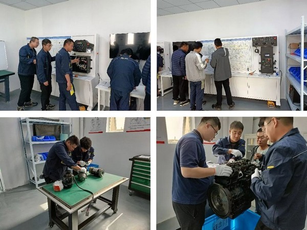 臨工重機在華東營銷服務中心建立了現(xiàn)代化實訓基地,包括整機電路、發(fā)動機翻轉架、液壓系統(tǒng)拆解平臺,其中包含各種電器元件,如上控箱、下控箱、電機控制器、各種傳感器等,液壓系統(tǒng)包括負載敏感泵、多路閥、各種液壓執(zhí)行元件,并配備久保田2403發(fā)動機一臺,供現(xiàn)場拆解教學使用。